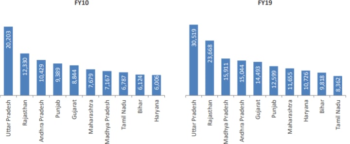 The top 10 states of milk producers have continued to remain constant over the last few years accounting for a share of over 80% in the total milk production in the country. In FY10, Madhya Pradesh ranked 7th in milk production and it has moved up to 3rd position in FY19, while Punjab has moved to 6th position, down from 4th in FY10.