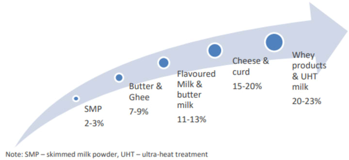 During the last five to ten years, India has seen dramatic shift towards the consumption of value-added products such as cheese, yoghurt, UHT (ultra-heat treatment) milk, flavored milk, and whey. To tap the advantages of the changing consumer food preferences, most organized players are expanding product portfolios in the value-added segment. This segment offers high growth potential and better margins versus the liquid milk and Skimmed Milk Powder (SMP) segment.