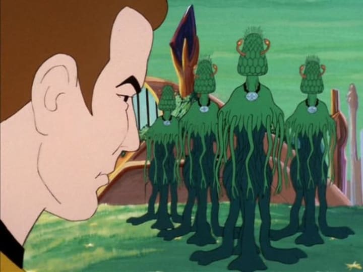 Check out these awesome aliens. Without the limitations of costumes (shower curtains and body glitter? Hand puppets?) TAS could truly get wild and not just with Klingons. On the left we have our standard "alien" who we'd regularly see in early episodes of TOS and its successor, The Next Generation, before we had nifty CGI and super-fancy makeup. On the right... we have another perfectly ordinary galactic citizen, the likes of whom we probably wouldn't see back then (well, we might, but we'd laugh), but could now. And it'd be awesome. We can do this stuff now. Let's get wild again. More non-humanoid aliens! Yes!
