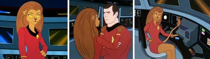 Some might even have furry faces. Like recurring Bridge Officer Lieutenant M'Ress. I admit it, I have a favorite - but she illustrates (ha, animation joke) a great point here.