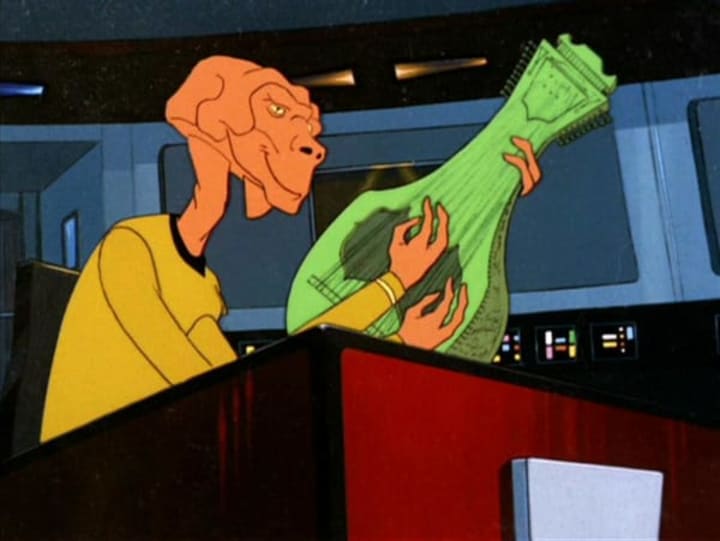 And it's not even just one-off Weird Planet of the Week-style. We've got our new life and new civilizations right there on the bridge. Like the guy below, Lieutenant Arex; he was a recurring regular. And he could play many a mean chord with his three hands.
