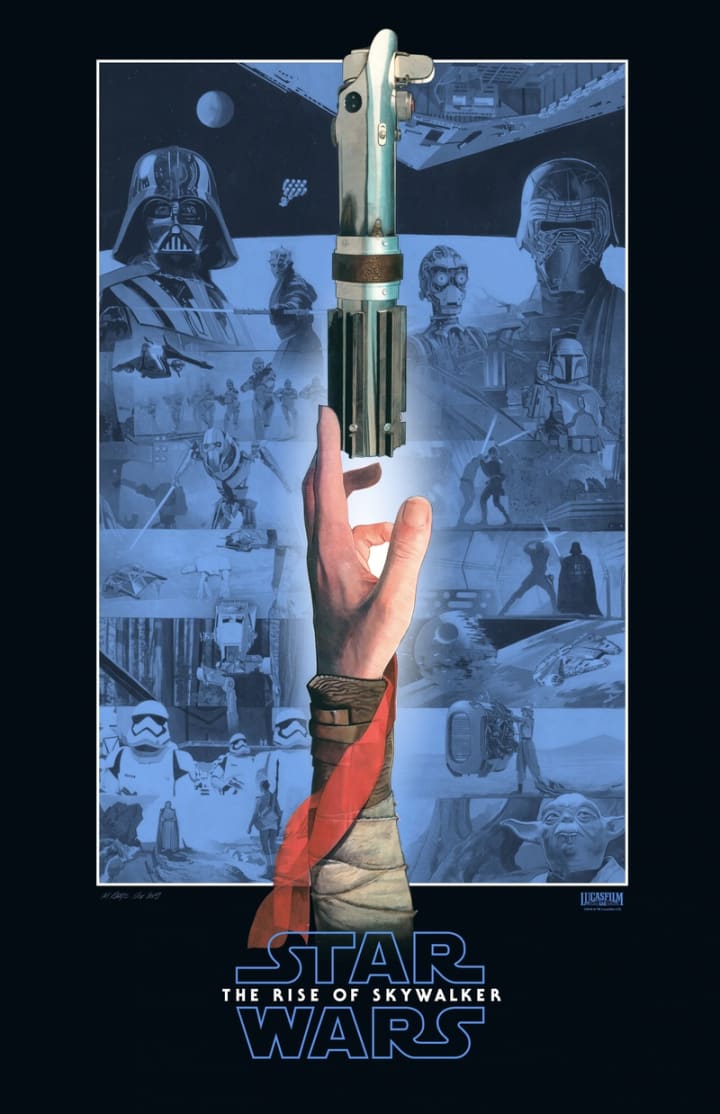 Raats’ creativity never ceases to amaze when it comes to his posters. Take the poster he created for Star Wars: Episode IX - The Rise of Skywalker, which shows the hand of Daisy Ridley’s character Rey holding Anakin Skywalker’s lightsaber. In the background of the poster, Raats drew many characters from the entire Skywalker saga, giving a huge shoutout to the prequels and the original trilogy. The poster itself is very simple compared to the one he did for the The Mandalorian finale, as the one for the series displayed two changes in temperature colors.