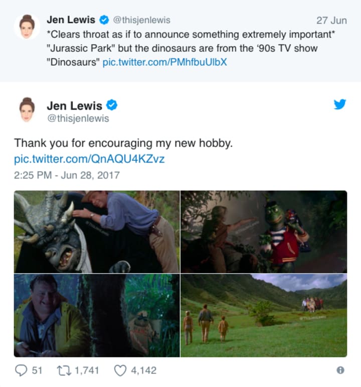 Hopes aside, until Lewis decides to pursue this artistic medium further, we'll have to wait and see what she comes up with. Fortunately, Lewis left us with one more fantastic mash-up that every fan of Jurassic Park and Dinosaurs can enjoy.