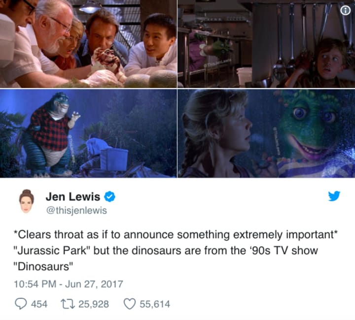 The latest artist rendition to make the headlines is a clever mash-up between 1993's Jurassic Park and the '90s sitcom, Dinosaurs. Jen Lewis, the artist responsible for these awesome creations removed the dinosaurs from classic scenes in the first Jurassic Park movie, and replaced them with members of the Sinclair family — a family of anthropomorphic dinosaurs who were at the center of the Dinosaurs sitcom. Lewis posted her artistic renditions on Twitter a little under a week ago. Check them out: