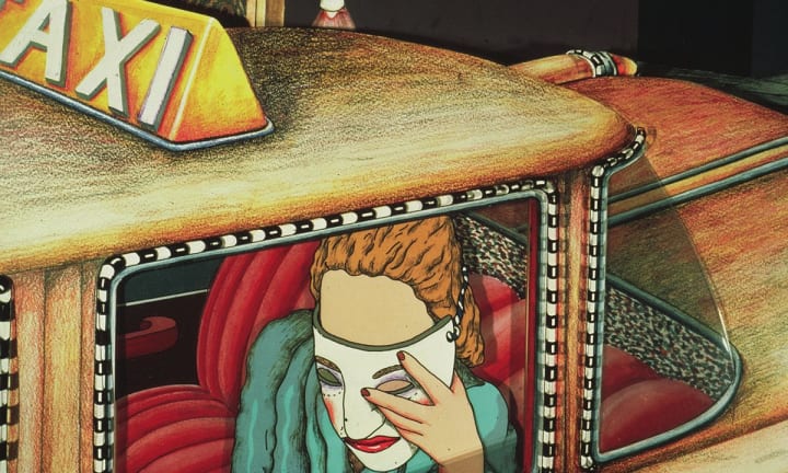 Back in the cab, with bizarre, floating visions following her out the door, she once again pulls down her mask, revealing her facelessness, her lack of a formulated sexual identity. At home again, she strips, revealing the swell of her naked breast.