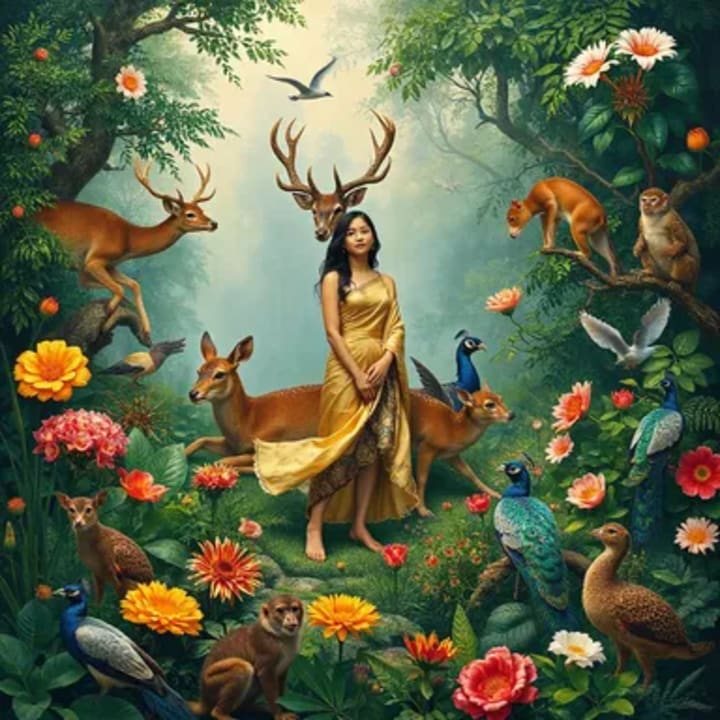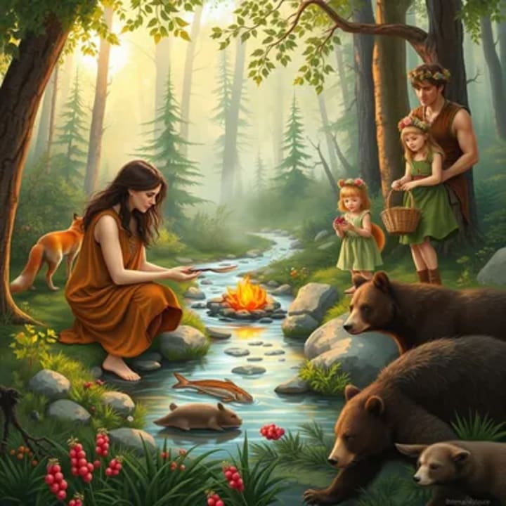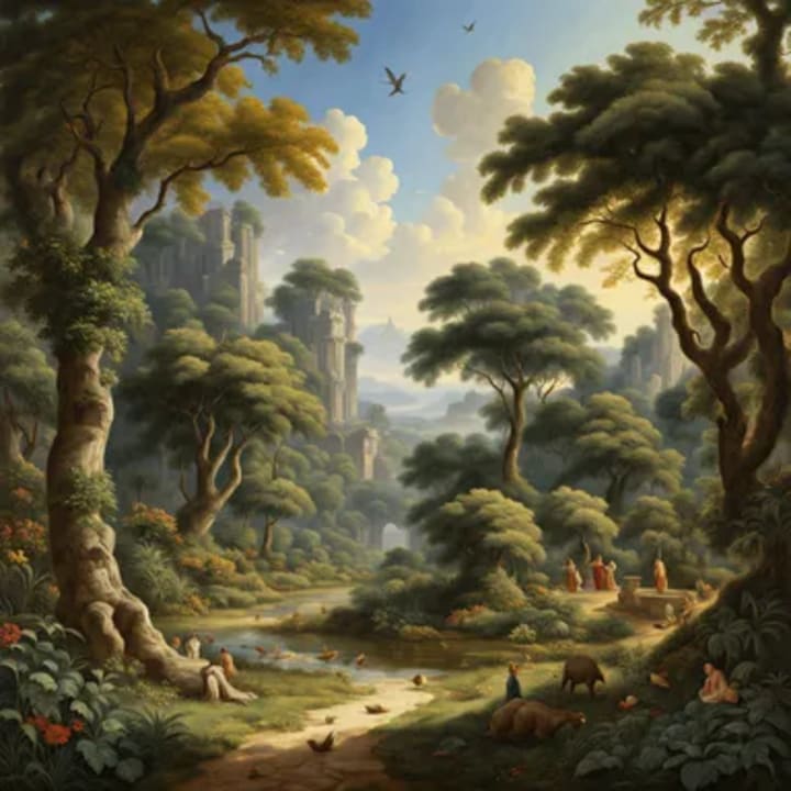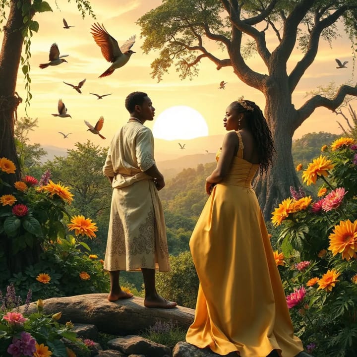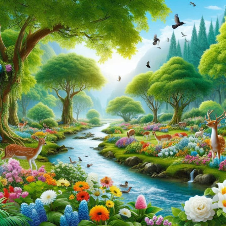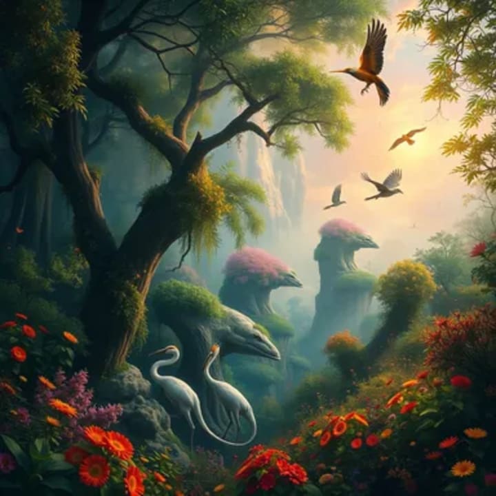 The creator waved his hands towards a fertile corner of the land below...Beings appeared as if by magic.
