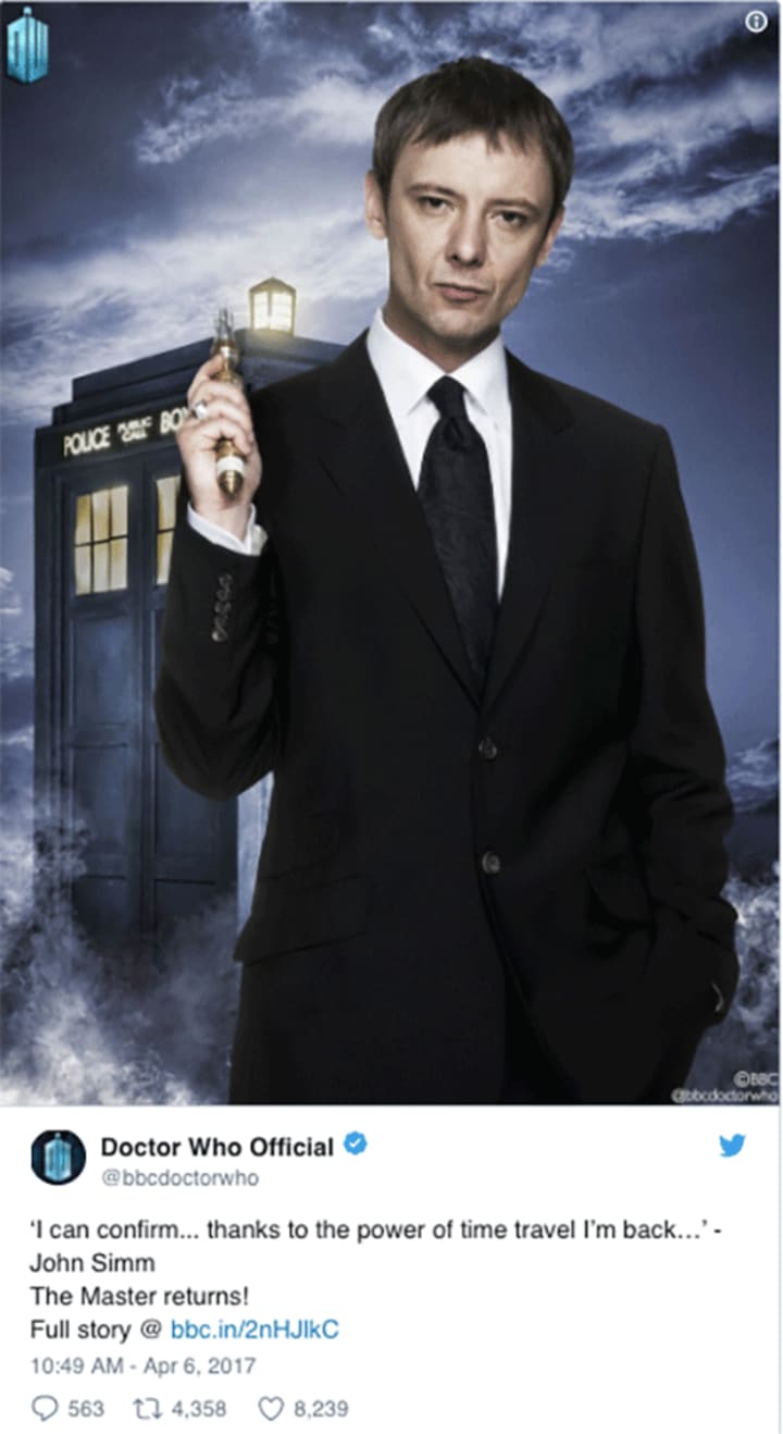 Fans of Doctor Who were not meant to be told about Simm returning as The Master until an exclusive trailer aired directly after episode one titled 'The Pilot' on Saturday 15th April. But, due to The Sun newspaper leaking out the major spoiler, the BBC were given no choice but to confirm this was true.