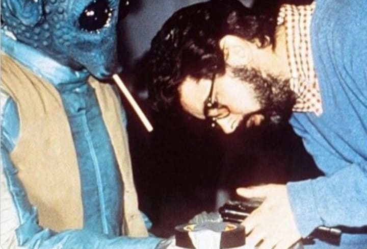 This next photo features a more comedic moment during the filming of A New Hope. We see the actor who portrayed Greedo having a cigarette next to the creator himself, George Lucas. It is always amazing to see sweet moments like this one behind the camera in a film.