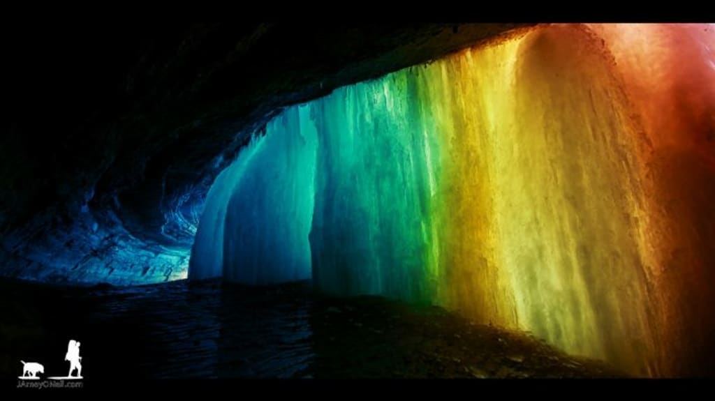 Past the light, she begins walking down a path, a pebble path, with stepping stones. These stepping stones, slowly changed colour with every movement, whether it be a step of a stone or the blink of an eye. The colours were vibrant red, green and purple, amongst colours never seen before, beautifully indescribable. All that was either side her, was 2 metre hedges with harmonizing plants, similar to flowers, roses perhaps, but not like any seen before. She finds herself in front of a waterfall, a silent yet beautiful waterfall, like sprinkling rain in the sun, gently squeezed together with a rainbow.