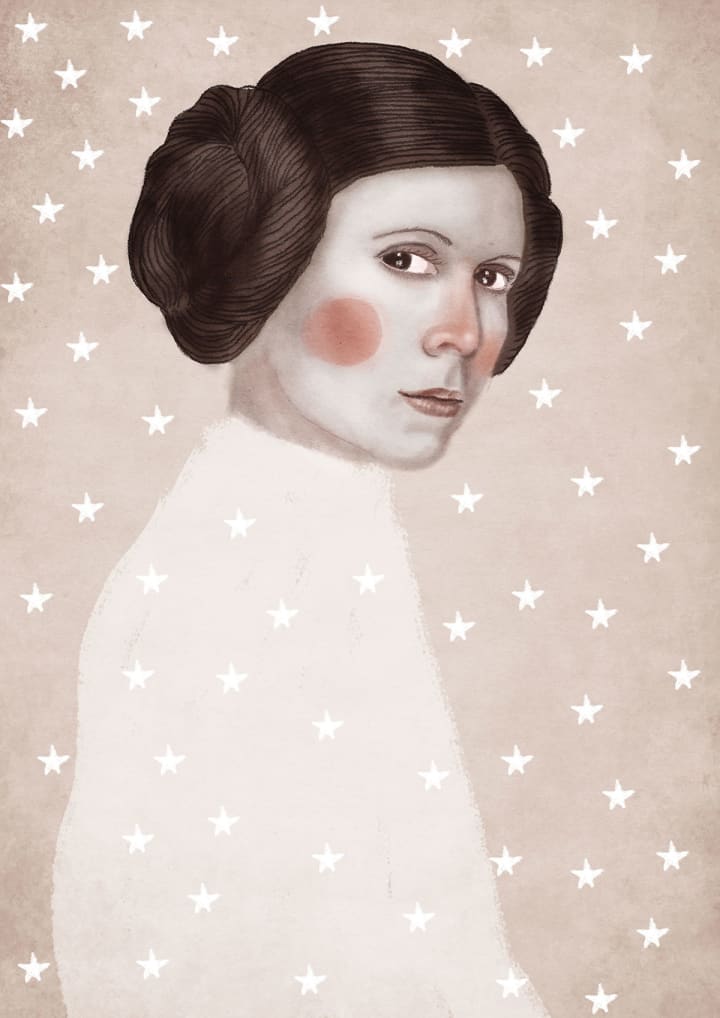 What strikes me as I surf through the seemingly infinite body of Carrie Fisher tributes is the lack of distinction between her onscreen activities–she is best known for playing Princess Leia Organa in the original Star Wars’ trilogy–and offscreen activities– she advocated for female empowerment and mental health awareness and wrote as both a novelist and screenwriter. Most tribute creations feature Princess Leia, but lack the additional intergalactic trappings one would expect from a Star Wars fanatic.