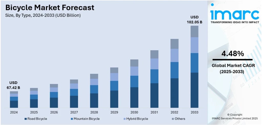 According to IMARC Group's latest research publication, global bicycle market size reached USD 67.42 Billion in 2024. Looking forward, IMARC Group expects the market to reach USD 102.05 Billion by 2033, exhibiting a growth rate (CAGR) of 4.48% during 2025-2033.