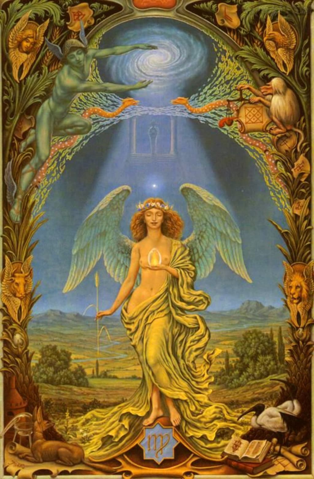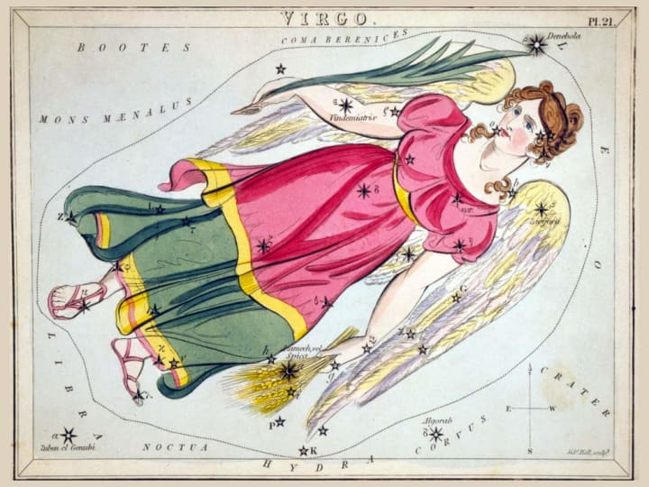 Virgo, the sign of the virgin, is depicted as a young woman, often holding an ear of wheat or corn, highlighting the signs' connection with the earth and harvest season; when the earth can be seen as a virgin land about to bear new crops. Due to its connection with the earth, Virgo is a very realistic and practical sign, associated with hard work, service, and productivity, and as a symbol of purity, humility, and perfection. It is often associated with the Greek fertility goddess, Demeter, as well as the Virgin Mary. It is also often thought to be a depiction of Astraea, the Roman goddess of law, holding in her hand the scales of Libra, the next sign of the zodiac. Thus the signs of Virgo and Libra, are deeply interconnected, as both are idealists seeking perfection, but while Libra, as an air sign, symbolizes lofty ideals such as fairness and harmony, Virgo, as an earth sign, is more at home in the material realm. Virgo, as an earth sign, is more about the hard work and service needed to reach these ideals. As a perfection-seeking sign at home in the material realm, Virgo is also associated with health, cleanliness, and the perfection of a skill.