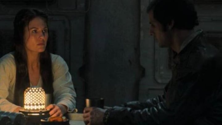 In chapter 2 of The Book of Boba Fett, our main character is seen going to a local watering hole during a flashback sequence to steal a bunch of speeder bikes to assist in his great train robbery. When we come into the scene about 5-10 minutes beforehand, the gang is running around the train, and acting the way gangs act by bossing people around to get what they want. A particular couple seated by themselves seems a little bothered by the whole scene. When the man speaks up, he is immediately pummeled by the gang and is about to be killed when Boba Fett enters the bar and deals with them.