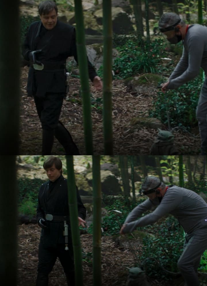 Then there is a photo from this exact same scene, showing Hamill talking to a Grogu puppet. The hands of a puppeteer in grey gloves the puppet’s mechanisms can be seen.