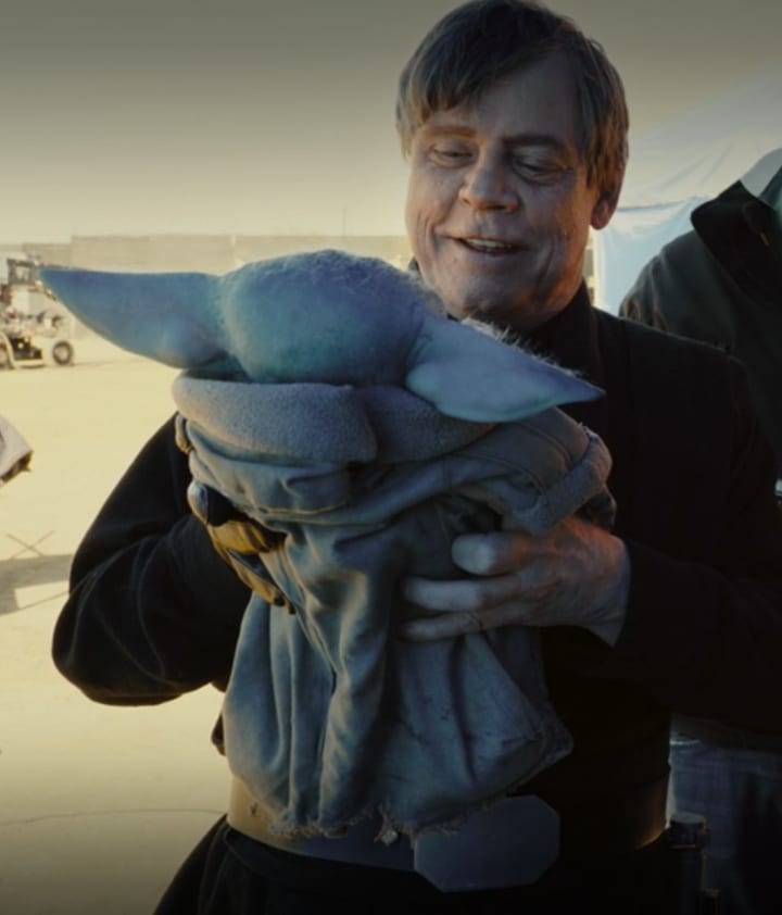 The last picture that was revealed today has Mark Hamill happily looking at the Grogu puppet in a not too different way from when George Lucas held the little green friend when he visited the set of The Mandalorian.