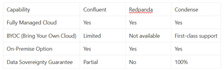 At the core, Confluent and Condense are Kafka-native platforms. Redpanda, while Kafka API-compatible, reimagines the internals with a custom engine.