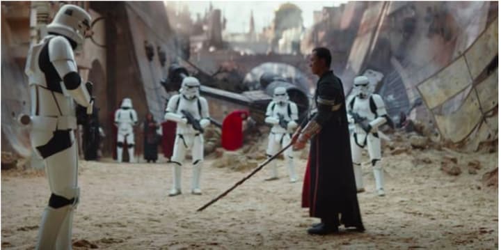 Imwe and Stormtroopers in 'Rogue One'. [Credit: Lucasfilm]