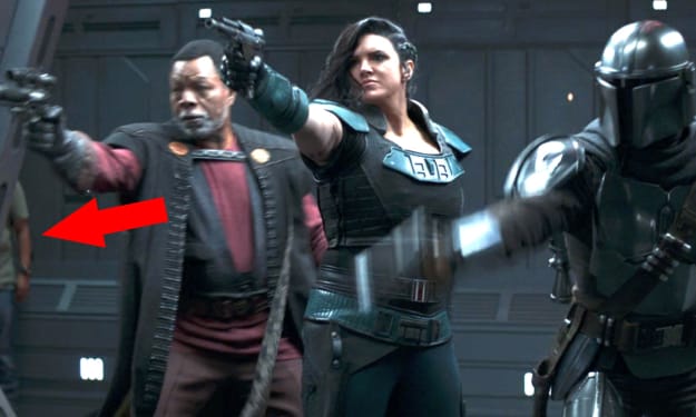 Here’s the story. After the release of “Chapter 9: The Marshal”, a photo appeared on IGN of one of the residents of Mos Pelgo, the town on Tatooine that is highlighted in the episode. The photo features a man in the background of the shot pushing cargo and looking towards Mando as he rides into town. But here's the kicker: in the details of the photo, IGN tags this character as Sam Witwer in an uncredited cameo!