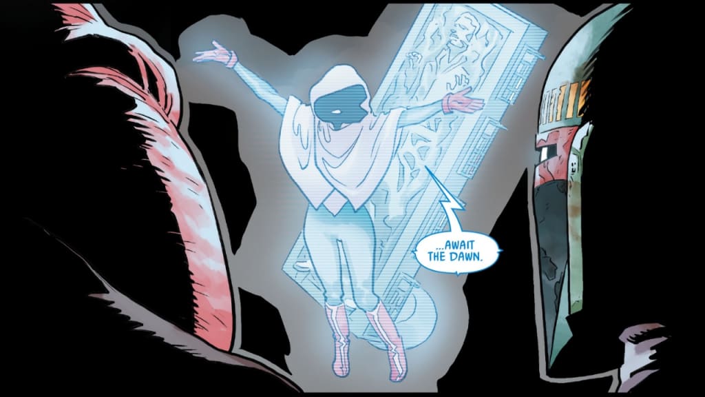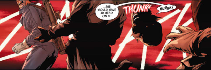 No wonder Vix was more than willing to give away the information that Crimson Dawn has returned and taken Solo. He also talked about a mysterious “she” who would kill him, if she knew that Vix was talking. Valance found this hard to believe at first, as there had been no signs of the organization’s existence for years. And just before the alien could spill any further information about Crimson Dawn, a mysterious masked female assassin called Deathstick cut off Vix’s head and then attacked Valance and Dengar, wounding the first and suddenly making him believe that Crimson Dawn was actually back.