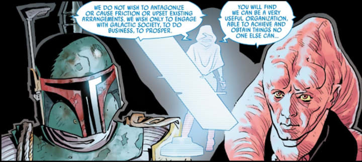 Issue 1 of the 5-part main series concluded with the revelation that Crimson Dawn had taken Solo from Fett. The criminal organization had joined Darth Maul’s Shadow Collective shortly before Order 66. Its formal leader Maul mostly stayed in the shadows while Dryden Vos acted as the public figurehead of Crimson Dawn, with Solo’s former girlfriend Qi’ra as his second in command.