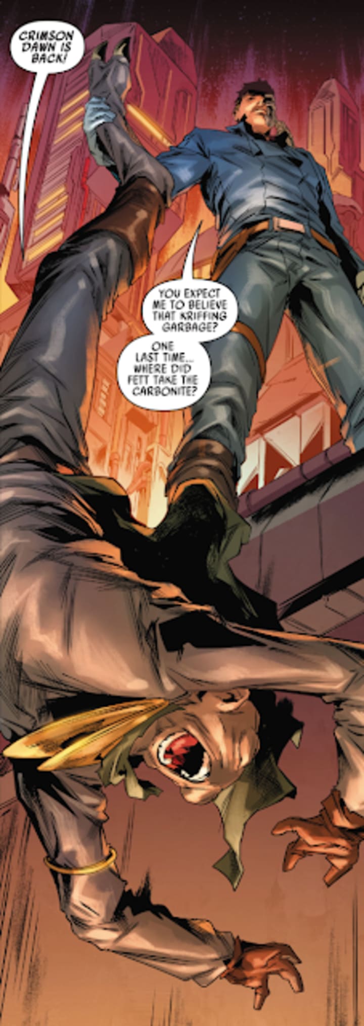 But already issue 0 of War of The Bounty Hunters showed that Crimson Dawn is as ruthless as ever, when its thugs brutally killed a Besalisk whom Fett had hired to restore the deteriorating carbonite.