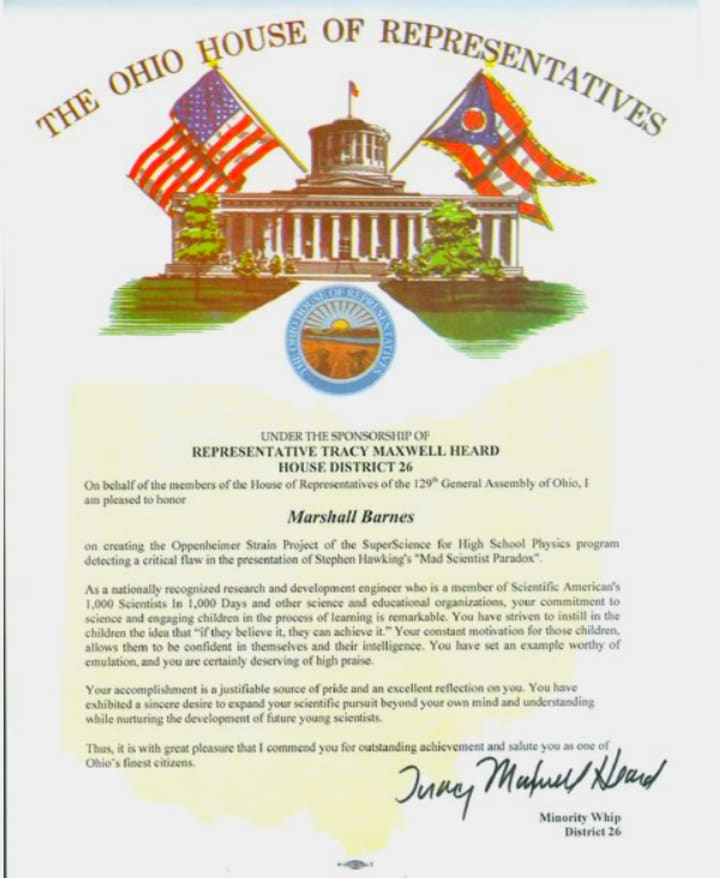 6. Proved Stephen Hawking's Mad Scientist Paradox wrong in 2012 with a physical experiment in the paper, Experimental and Theoretical Analysis Of Chronology Protection Conjecture Failing On The Discovery Channel and a physics class, using a solid body electric guitar. I was awarded a proclamation by the State of Ohio for proving elementary school students could see the flaw in Hawking's conjecture when given a chance.