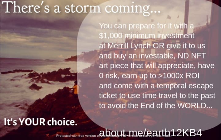 And the funding of this operation is a fraction of the cost of one of your rocket launches - <$100,000. Funding is coming from the sale of a special type of NFT I invented in 2021 that features a red/blue 3D tweeked artwork from a 100 piece collection of mine that is labeled and framed with QR code. The actual art pieces are originals that are never seen "nude" except by the buyer, protecting it from digital copying or piracy. At $1,000 a piece for the original digital file, enabling a choice of display sizes, each one is more than affordable, especially when you consider the certificate of ownership gets the bearer a ticket out of here via a safe escape to the past - if and when that becomes possible.