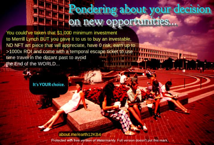 When Merrill Lynch dropped their minimum investment down to $1,000, they became a target and my competitive on-ramp for sales into financial markets. First, with concept advertising to introduce the idea of the art as an investment and financial product, with a personal assurance benefit against the End of the World.