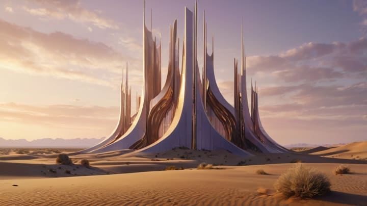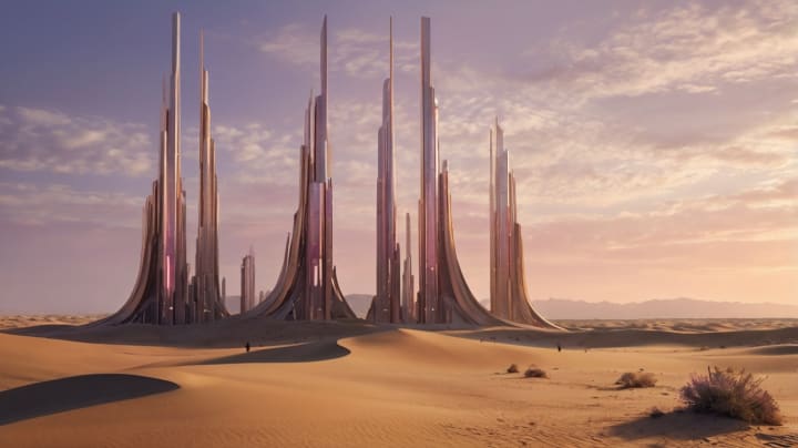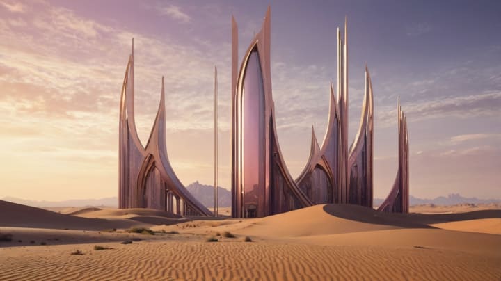 Artwork 1: Steel towers blooming from dune shadows. A digital canvas where metallic spires emerge from soft, undulating sands, their reflections shimmering like mirages under a pastel sky.
