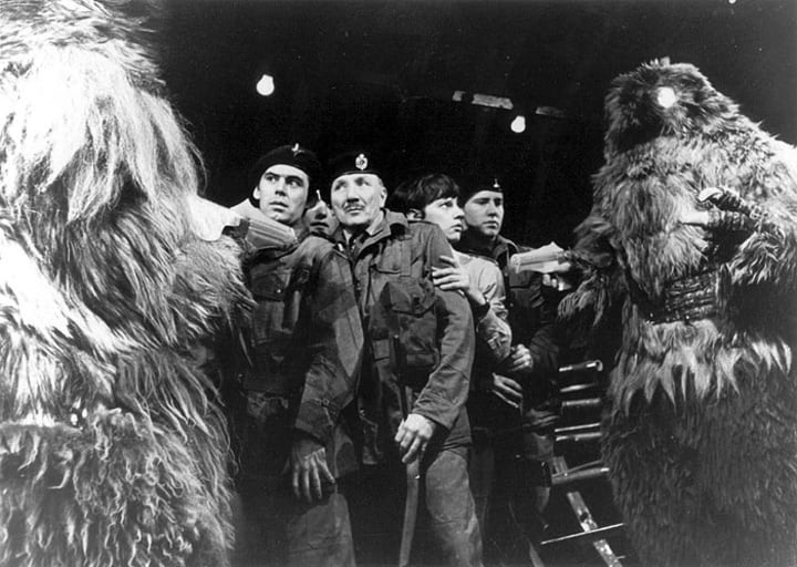 The monsterous Yeti threaten Jamie and a group of soldiers in a publicity picture from the serial.