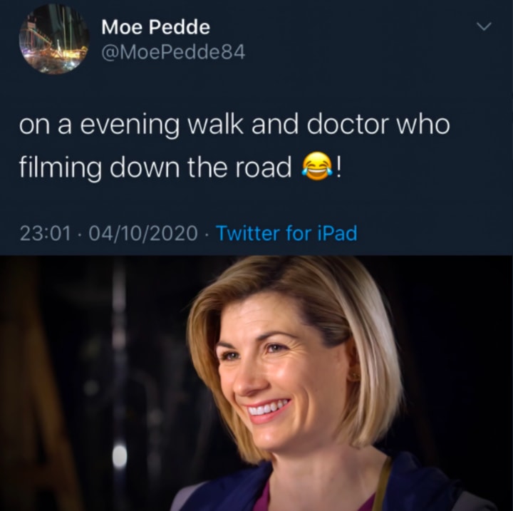 “On a evening walk and Doctor Who filming down the road!”