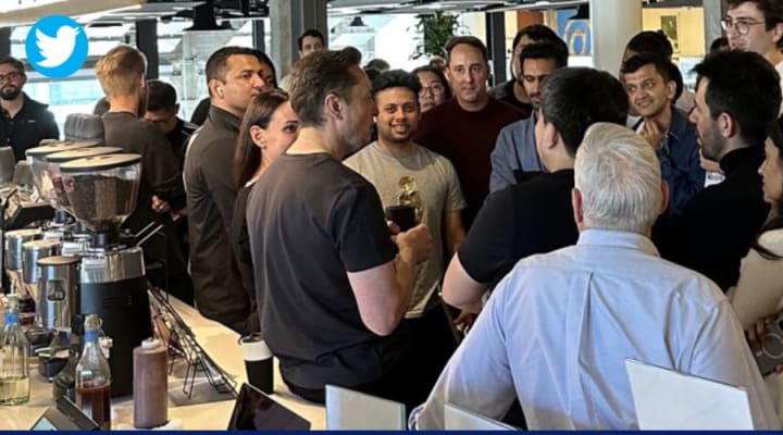 On Thursday, American author Walter Isaacson captured a picture inside the Twitter offices' coffee bar showing Musk speaking to a gathering of people.