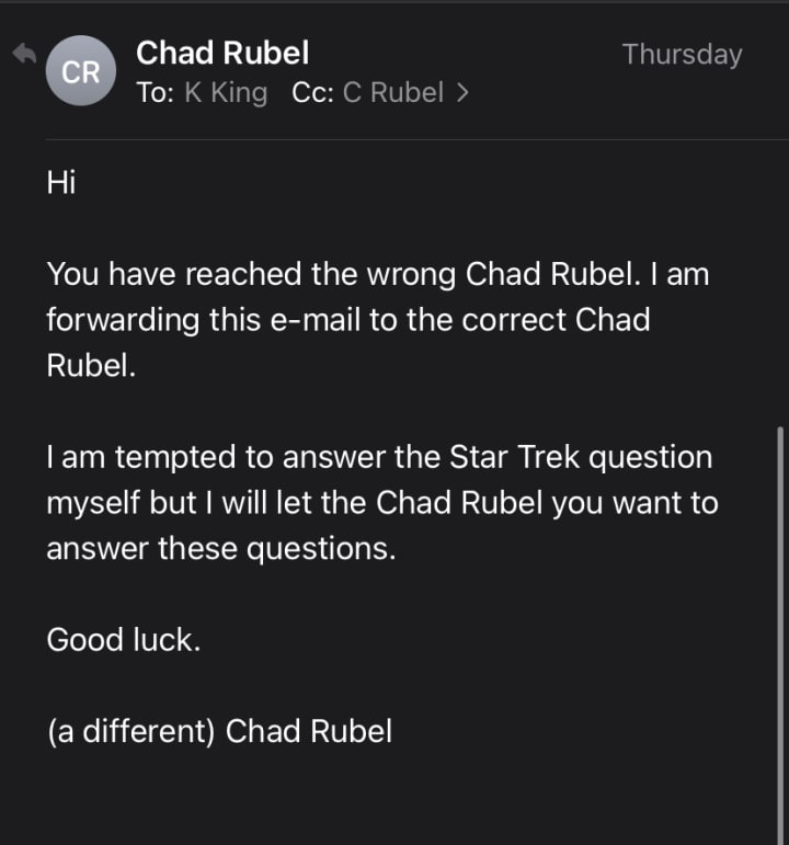 I just love it when fun little mishaps like this happen, don’t you? P. S. Still waiting on Different (possibly Mirror Universe?! Gasp!) Chad Rubel’s responses to my “fave Star Trek character” questions! You’re not off the hook yet, mister!