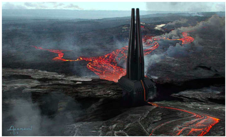 The idea is that Vader's home is an older structure, one that he's heavily adapted to his own purposes. The ancient structure was designed partly as a dam, and draws power from the lava lake beneath it. Going even deeper, though, is a cave - one steeped in the power of the Dark Side.