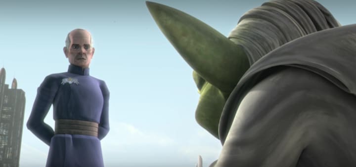 After his disappointment in Valorum’s portrayal in The Phantom Menace, Terrance Stamp declined to return to Star Wars. However, that did not mean the end of the character. It took fifteen years, but Valorum returned to canon in The Clone Wars season 6 episode “The Lost One,” voiced by Ian Ruskin. In the episode, Yoda speaks with the former chancellor about Jedi Master Sifo-Dyas and the creation of the Grand Army.
