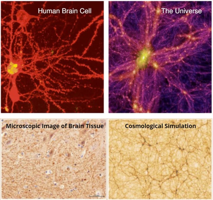 The photos on the left show us images of brain cells magnified closely where a network-like structure can be seen. On the right side we see a photograph (top) and a computer simulation (bottom) of our universe extending 300 million light years across. Can you see the resemblance?