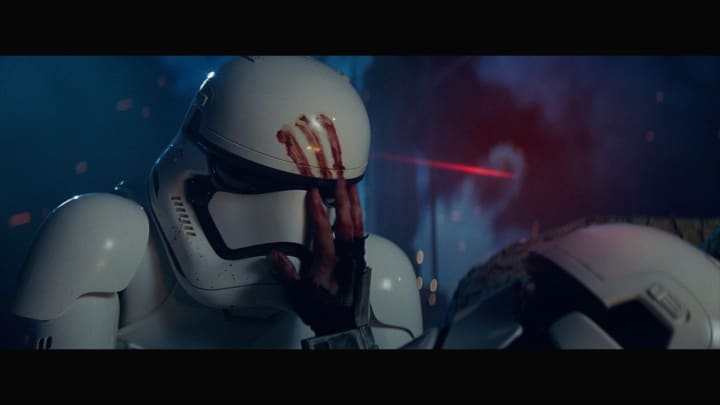 Star Wars: The Force Awakens delivers a compelling opening. While pursuing a star map, stormtroopers massacre a small village on Jakku. In the middle of the battle, an unnamed stormtrooper kneels to examine his fallen comrade. A bloody palm print stains the stormtrooper's helmet, rattling the stormtrooper.