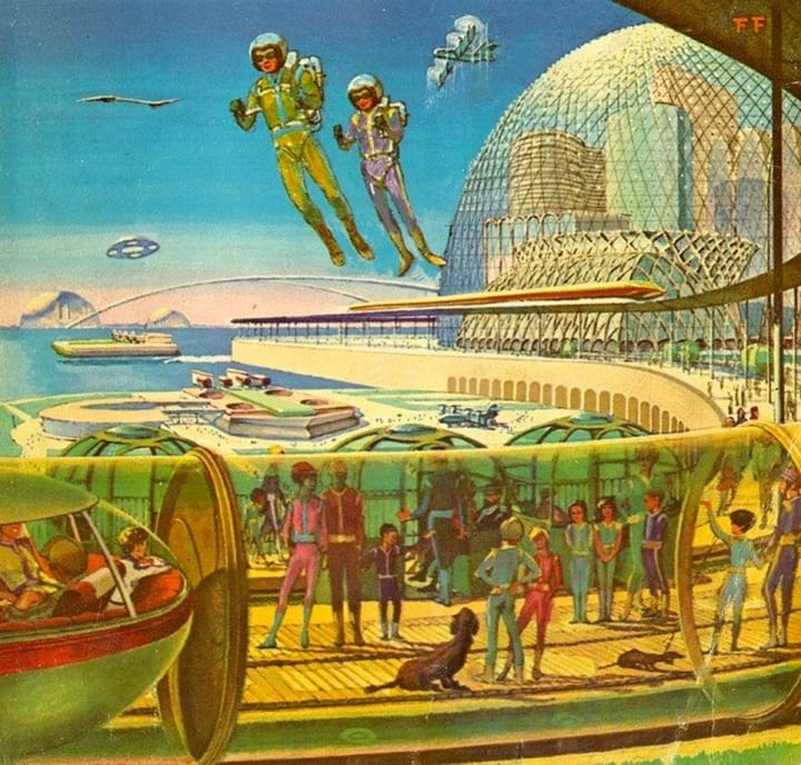 In the lexicon of science fiction, urban archetypes were quickly established, and tend to be universally recognized. For one, the Cyclopean megalopolis: the concept of a future city taken to extremes, with massive interconnected towers built as tall as imagination allows, covered by a transparent dome, unified, fully automated, replete with landing pads, raised roadways accompanied by frantic aerial traffic, and a gadget-laden populace, whose only pursuit is leisure. In the early 20th century, all signs pointed to such epic arcology as the apex of urban engineering.