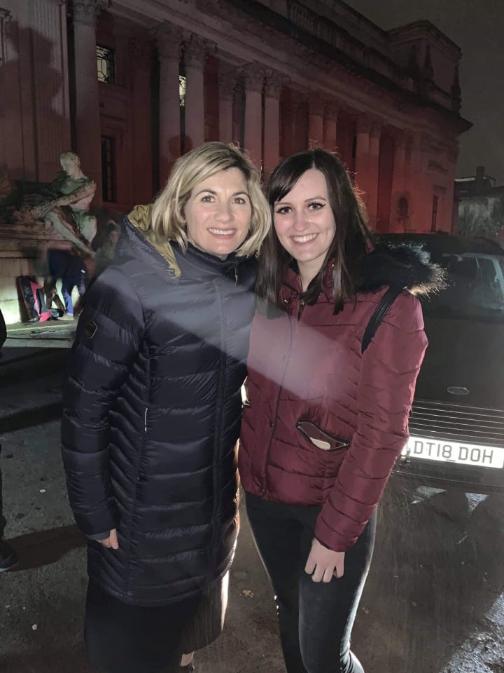 “Two night shoots in a row and I finally met Jodie Whittaker (and outside my uni building at that!) She’s SO lovely!!”