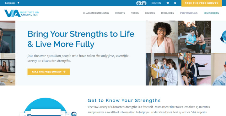Because each sign has its own set of strengths, the first survey I will be taking is the VIA survey of Character Strengths. It's a brief 15-minute survey that can be used to identify the intensity of 24 universal strengths. These strengths are based in positive psychology, which is a field that focuses on the graces of the human mind and experience rather than the lens of pathology in contemporary psychology.