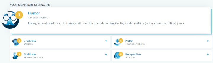 Overall, I completely agree with my evaluated strengths. My humor, even when coping with the morbid and dire, helps me to get through my days. Additionally, my creativity is essential to who I am; I can consistently discover new ways to think about things, and I enjoy sharing those ideas with others even when it makes me look crazy.
