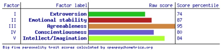 In this case, they are extraversion, emotional stability/neuroticism, agreeableness, conscientiousness, and imagination/openness. Also, the final scores are not based on a general percentage of one trait or the other, but rather based on the percentile, or where you score relative to others in each trait. Don't worry, this one is much more self-explanatory than the NERIS, so let's get right into the results.