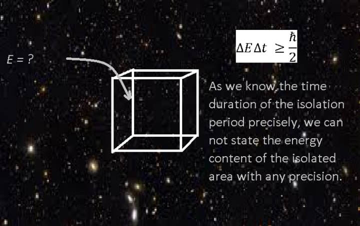 Imagine we could isolate a small portion of space in a box of some kind and seal it for a very precise length of time. As we know the time-period of this isolation with little uncertainty, Heisenberg's uncertainty principle demands a large uncertainty in the energy content of the box for this period.