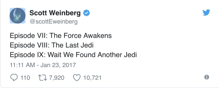 It was fanboy overload as Lucasfilm finally announced the long-awaited title for the eighth Star Wars film. "OMG they called Luke the last Jedi in the crawl for Episode VII, mind blown." Whether planned or not, the ominous title for #RianJohnson's upcoming #StarWars film seemingly spells doom for someone in the dwindling Jedi population. Cue internet trawling to decipher what on Earth the title could mean: Does it signal the demise of #LukeSkywalker, the training of Rey, or even the return of Yoda? The Last Jedi will keep us guessing right up until December 15.