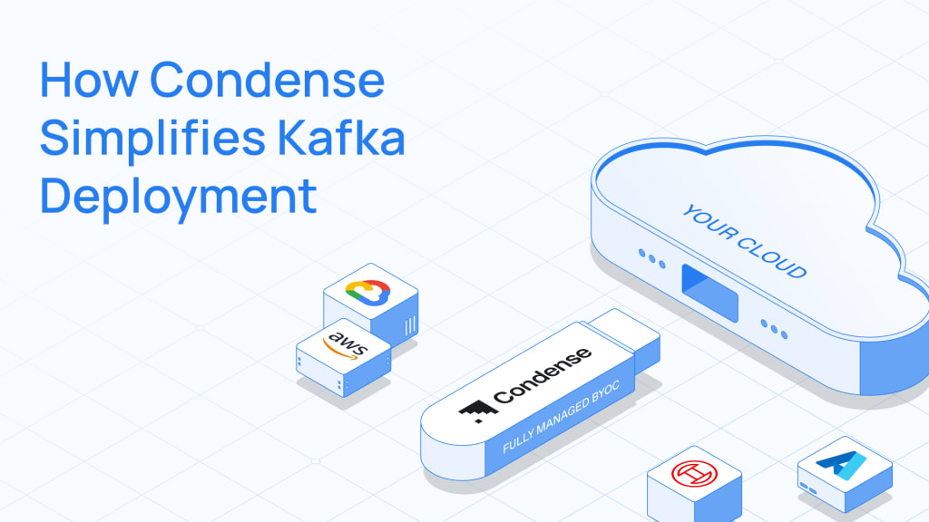 Condense simplifies Kafka deployment dramatically by offering a fully managed, verticalized, BYOC Kafka native streaming platform — now available directly from the AWS, Azure, and GCP marketplaces.