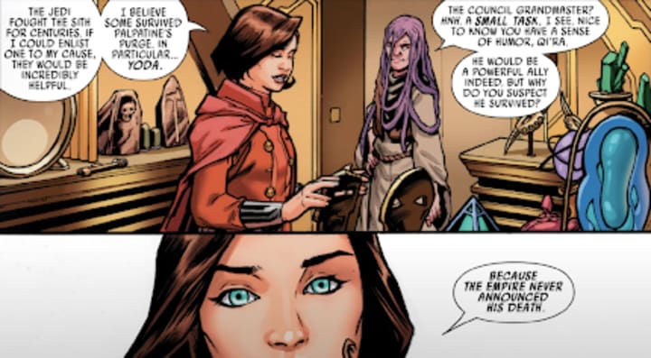 Over the course of Crimson Reign's first few issues, we've seen Qi'ra and her crime syndicate set the stage for their attempt on Palpatine's life. From starting a war amongst the major crime families, to assassinating the Emperor's royal guards, Qi'ra is making the distractions and gathering the forces she needs in order to strike at the heart of the Empire. Crimson Reign's third issue continues this by showing how Qi'ra came to recruit Madelin Sun; a lonely archivist who specialized in studying Force-related artifacts until the Empire made owning such artifacts illegal. After saving Sun from a couple stormtroopers, Qi'ra reveals to her that Emperor Palpatine is none other than the Sith Lord, Darth Sidious, and that his quest to destroy the Jedi is what robbed Sun of her previous life. Expressing her need for revenge, Sun is taken by Qi'ra aboard her ship, the Vermillion, which houses countless dark side relics. Qi'ra then offers Sun all the relics she wants in exchange for her aid in Crimson Dawn's plan to destroy Sidious and his Empire. When Sun asks what Qi'ra wants her to do, Qi'ra says she wants Sun to find a surviving Jedi who could help them in their plan; Jedi Master Yoda.