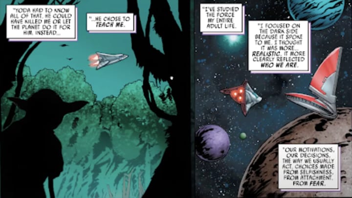 Throughout Crimson Reign #3, we see how Madelin Sun's life is destroyed by the Emperor and how Qi'ra attempts to use that to her advantage. Despite Sun being set on destroying Sidious, she is given another chance by Yoda, guiding her away from this destructive path and saving Sun and himself in the process. Yoda's role in the issue is, much like the character, small and large. While he is mainly in the background and visible for just a single panel, he has a profound impact on Sun and Crimson Dawn as a whole. With no Jedi on their side, Qi'ra's plan for revenge seems destined to fail. Much like the dark side, it will most likely leave her with nothing at all. But for people like Yoda and Sun who choose healing over vengeance, the Force is a powerful ally.