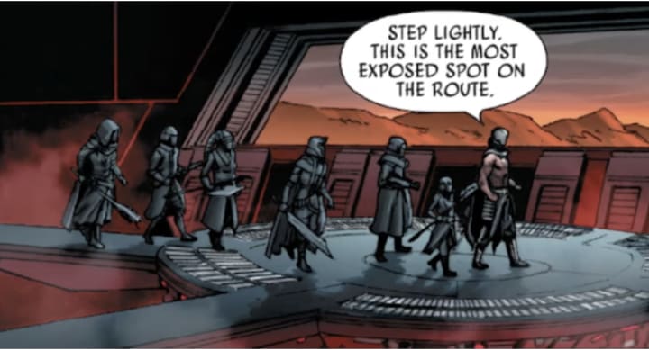Originally established in the sequel trilogy, the Knights of Ren have gone on to become a major staple of the current Star Wars comics. Charles Soule initially expanded upon the knights in his miniseries The Rise of Kylo Ren, which showed how Ben Solo was seduced to the dark side by Snoke and eventually became the knights's new leader. The Knights of Ren are a group of dark side wielders who use their power to raid and pillage in their pursuit of riches and renown. Essentially a group of dark side vikings, the Knights of Ren have carved out their own space in the Star Wars galaxy far from the reaches of the Sith. Though that quickly changed when the knights were met by Qi'ra, the current leader of Crimson Dawn. At some point during the original trilogy, Qi'ra met with the knights and their original leader, Ren to offer them a job in the near future; to steal a device called the Screaming Key from Fortress Vader. The knights accepted the offer and would soon be called upon by Qi'ra to complete their assignment.
