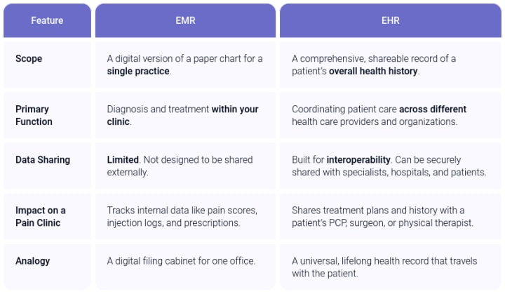 First, let’s clarify terminology. An EMR is specialized healthcare software that works as a digital version of the paper chart that contains a patient’s treatment history, diagnoses, medications, and notes within that clinic. An EHR (Electronic Health Record), in contrast, is designed to be shared across providers and facilities, giving a broader, interoperable picture of the patient’s health.