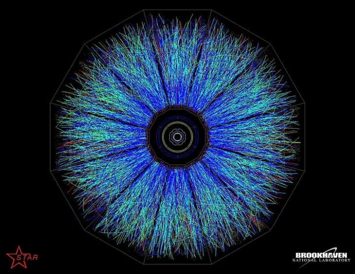 One of the first full-energy collisions of gold ions recorded by the STAR detector at RHIC (Brookhaven, USA). The colour tracks display the paths of thousands of particles formed by the collision as they fly through the detector. According to the asymmetry of the tracks, scientists noticed the phenomenon of "jet attenuation" - one of the two oppositely directed jets of particles disappears, losing energy in the quark-gluon plasma.